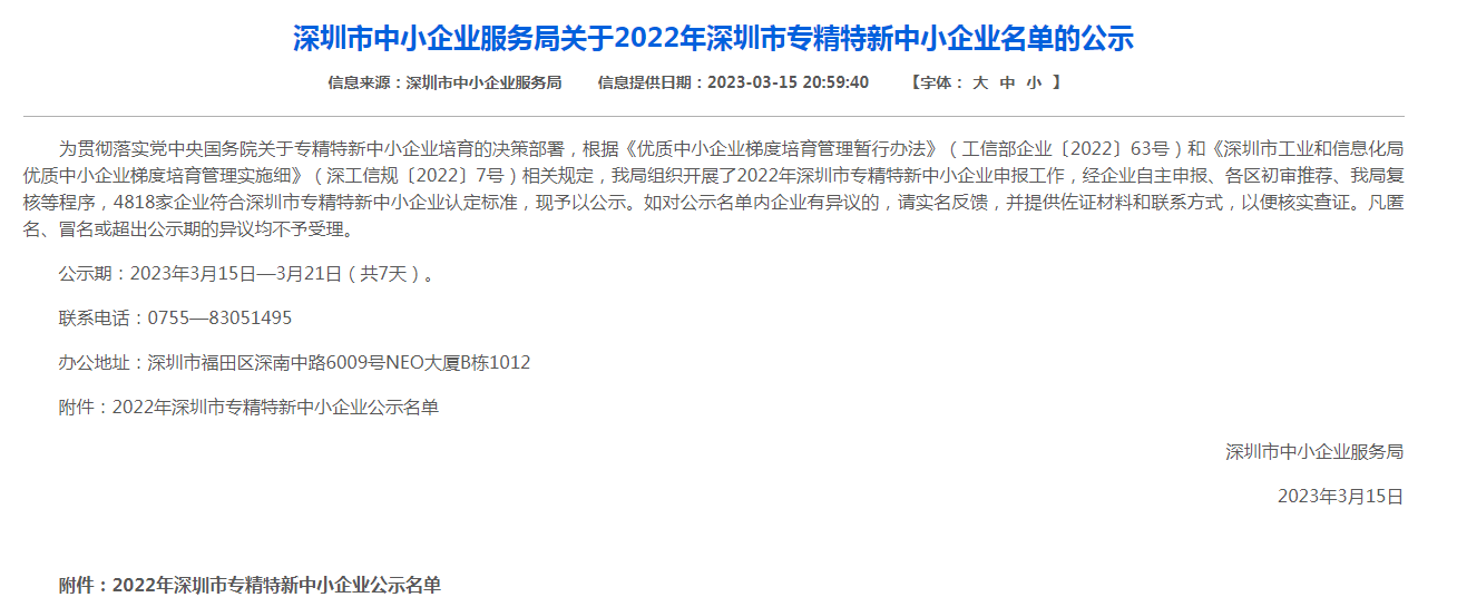 2022年3月15日,深圳市中小企業(yè)服務(wù)局公布了2022年深圳市“專精特新”中小企業(yè)名單,深圳市琉璃光生物科技有限公司名列榜單,榮獲“深圳市專精特新中小企業(yè)”稱號(hào),成為發(fā)展道路上新的里程碑。